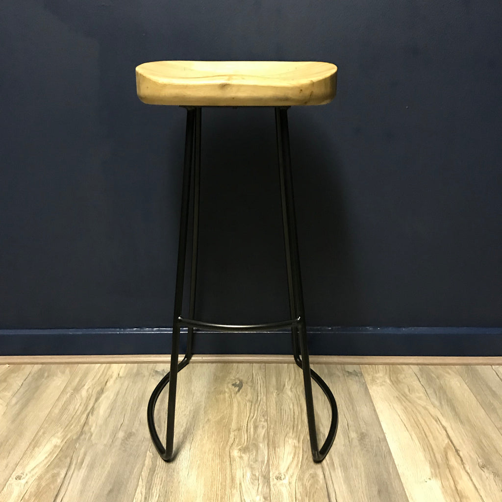 Pair of Weathered Oak and Metal Stools - CLEARANCEA tall weathered and washed oak stool with metal legs and a shaped seat for comfort. Size:H76cm x W41cm x D44cm If you have any questions, please use the contact link below to speak to us.