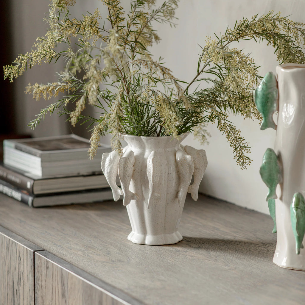 Portloe White Fish Vase 24cmThe Portloe White One.World Fish Vase, standing 24cm tall, showcases expert craftsmanship with its textured ceramic surface and soft speckled white glaze. Encircled by a sculptural ring of finely hand-painted fish, this vase combines coastal inspiration with artisanal detail. Its elegant fluted silhouette enhances its refined presence, making it ideal for fresh flowers or as a distinctive decorative object. This piece seamlessly integrates subtle nautical charm into both contemporary and classic interiors, offering lasting style and sophistication. Dimensions: