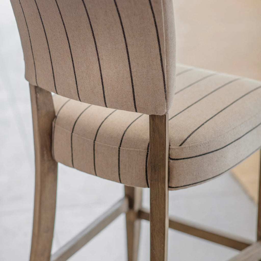 St Francis Striped Bar StoolThis refined bar stool by One.World showcases a softly curved back and seat, upholstered in vertically stitched fabric that adds depth and elegance. Its tapered wooden legs and muted hues create a polished look, perfect for both traditional and contemporary settings. Dimensions: