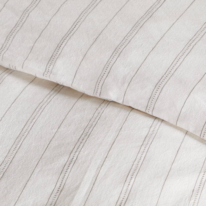 Anta Hemp and Cotton Duvet Cover - Sage Green - Size ChoiceThis duvet cover features a soft sage green stripe that blends effortlessly into a wide range of bedroom styles, acting as a gentle neutral. The breathable hemp and organic cotton blend offers a relaxed, comfortable feel that softens over time. Pair with our natural fitted sheet and matching pillow cases for a calming, cohesive bed. Each piece is neatly packaged in a fabric bag which makes for easy storage, or could alternatively be used as a garment bag. This duvet cover is made in Portugal using a thoughtful blend of hemp and organic cotton. Hemp is a naturally durable, breathable fibre that grows with minimal water and without chemicals, while organic cotton is cultivated without synthetic pesticides or GMOs. The wash temperature indicated on the care label represents the maximum temperature the bed linen can tolerate; washing at a lower temperature can help conserve energy. Always follow the care instructions on your product labelling. The fabric will naturally soften with each wash. If desired, a gentle fabric softener can be used occasionally. We recommend line drying for best results or tumble drying low and removing promptly. Note: Matching pillow cases can be purchased separately. SIZES:260 x 220cm - Super King 225 x 220cm - King 200 x 200cm - Double If you have any questions, please use the contact link below to speak to us.
