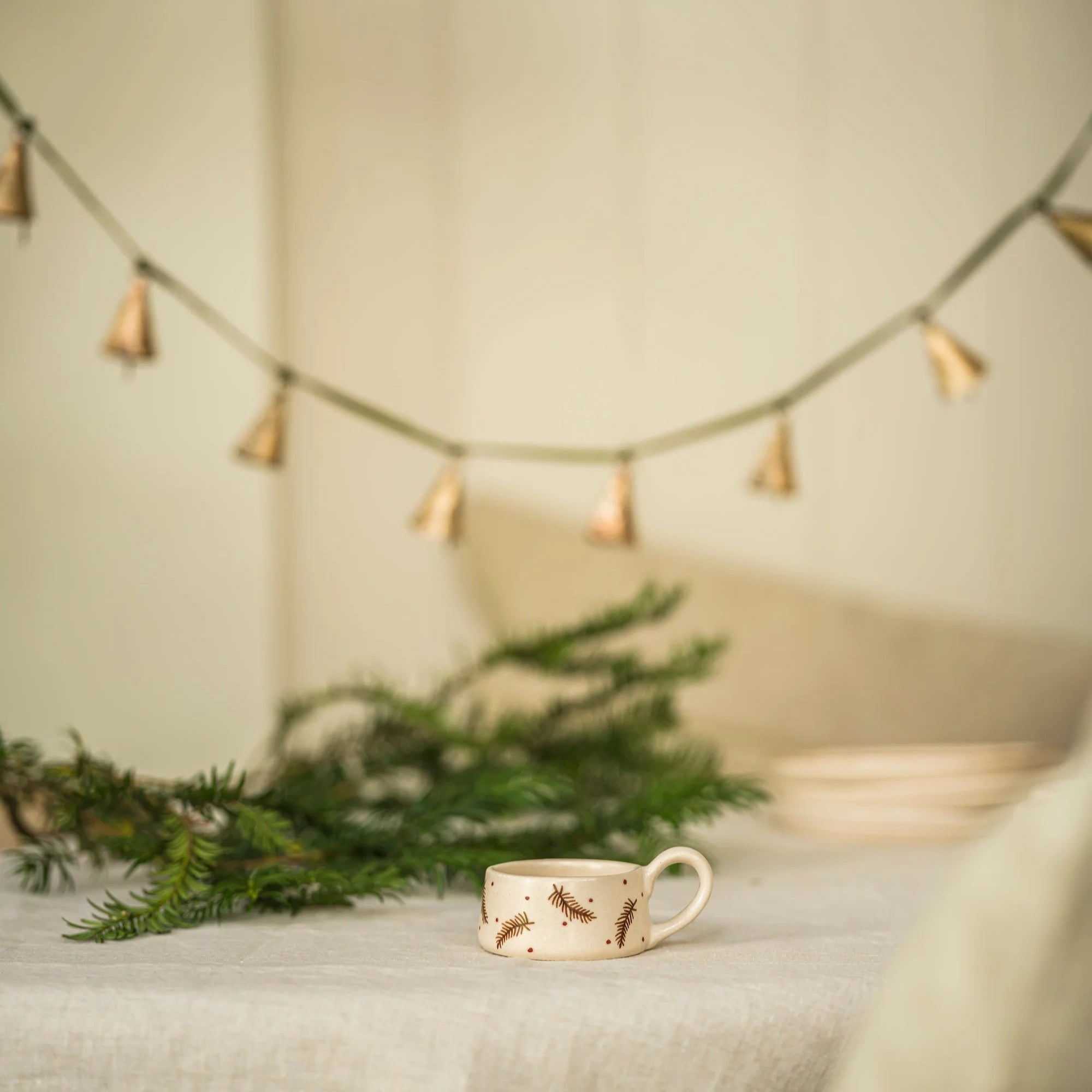 Hand Painted Tea Light Holder - Pine This elegant ceramic tea light holder features a soft matte cream glaze adorned with delicate hand-painted pine sprigs, evoking the quiet beauty of the season. Perfect for autumn and winter, it brings understated sophistication to any table top arrangement or seasonal display. A timeless gift piece that combines artisanal craftsmanship with versatile home styling appeal.