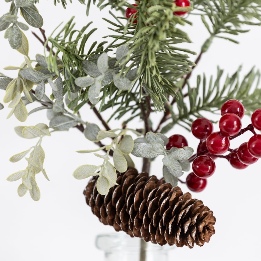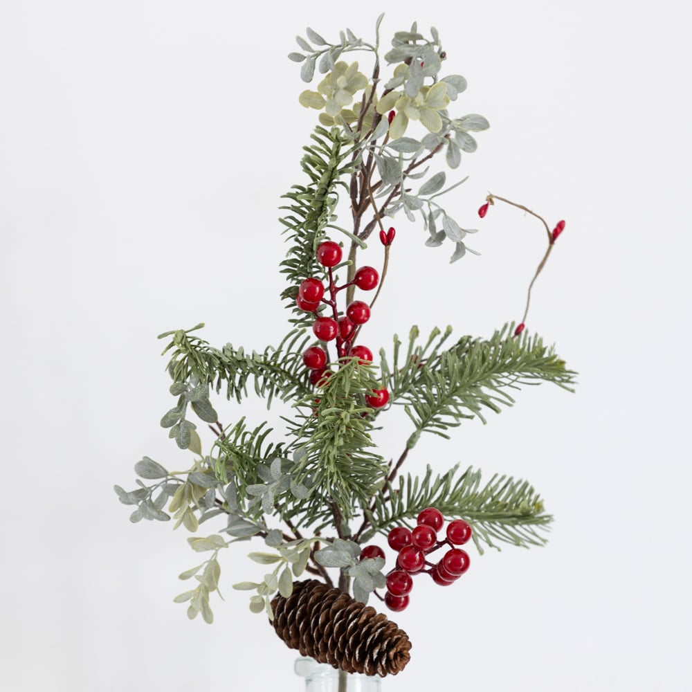 Red Berry Cone and Spruce Spray 70cmBring the festive spirit into your home with our 70cm Red Berry Cone and Spruce Spray. Featuring vibrant red berries, natural fir cones, and fresh spruce, this elegant arrangement adds a warm, traditional touch to any space. Perfect in a glass vase, on a mantelpiece, or as part of a holiday table setting, it creates a cosy atmosphere that captures the joy of the season. Dimensions:H:70 cm