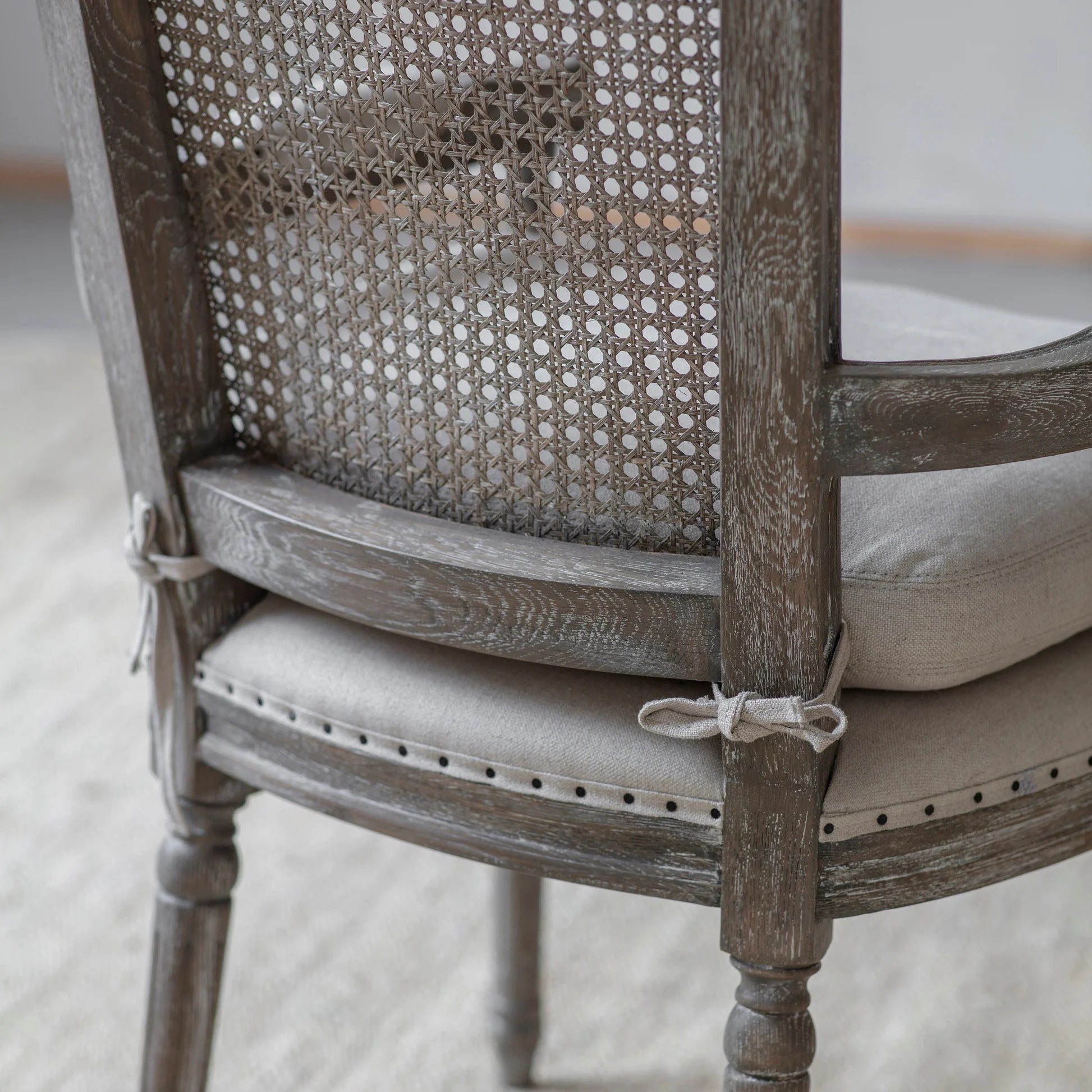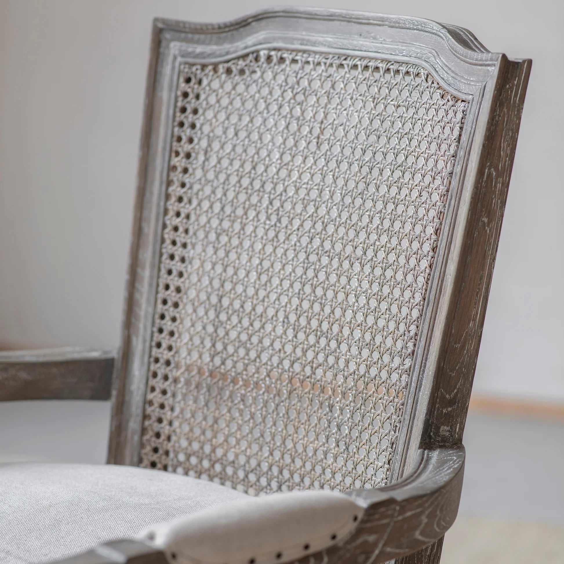 The Barton Bergère Carver Chair by One.World combines classic French design with modern comfort. Featuring a weathered oak frame, delicate rattan cane panels, and a linen-upholstered seat, it delivers both elegance and durability. Its curved arms enhance comfort, making it perfect for extended dining or as a distinguished accent in any room. Designed to complement the Barton Bergère Dining Chair or stand alone, this chair elevates your space with timeless sophistication. To maintain its beauty, avoid direct sunlight and opt for professional cleaning only.