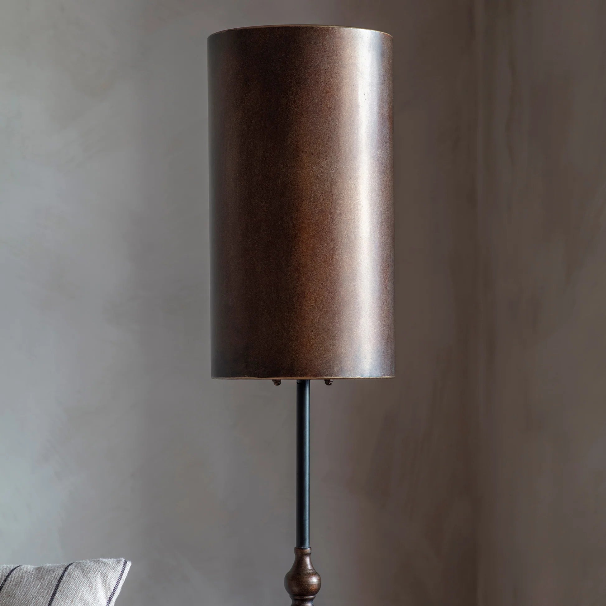 The Westwood One.World Spindle Floor Lamp stands 152cm tall, featuring a sculpted iron base with elegant rounded details in an antique bronze finish. Its slender silhouette adds refined height and character to any living room, bedroom, or reading nook. Equipped with a matching cylindrical shade (40cm height, 22cm diameter) and a black 15cm cable, it accommodates an E27 bulb up to 40W, combining vintage charm with modern sophistication. Weighing 5.7kg, this lamp is a timeless lighting solution crafted for style and function.